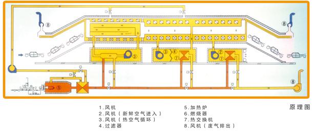 直通式烘干室結(jié)構(gòu)主要有:烘干室室體、進(jìn)出口端、熱交換系統(tǒng)、排廢(濕)系統(tǒng)、溫度控制系統(tǒng)、測溫系統(tǒng)、電氣控制系統(tǒng)等部分。