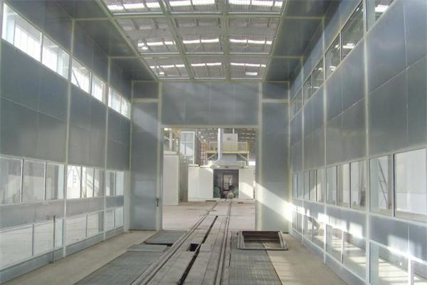 水旋噴漆室由室體、電動(dòng)門(mén)、漆霧過(guò)濾裝置、空調(diào)送風(fēng)裝置和排風(fēng)裝置組成;照明裝置安裝在室體內(nèi)兩側(cè),照度在500 Lux以上,可分組控制;室內(nèi)設(shè)可燃?xì)怏w濃度檢測(cè)、報(bào)警裝置,漆霧過(guò)濾裝置由洗滌板、液力旋壓器、地下水槽和排氣裝置組成。漆霧去除率> 98%;空調(diào)送風(fēng)裝置是使氣體形成層流狀的主要部件,送入供氣室的空氣經(jīng)過(guò)過(guò)濾,加熱后,均勻地由給氣頂棚送向室內(nèi),使室內(nèi)風(fēng)速均勻,無(wú)工件時(shí)垂直風(fēng)速可達(dá)0 .35~0.4 m?s - 1 ;排風(fēng)裝置是用風(fēng)機(jī)將室體內(nèi)的含漆霧氣體經(jīng)液力旋壓管過(guò)濾,從水槽與洗滌板之間排出。