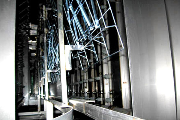 前處理設(shè)備根據(jù)工件形狀和生產(chǎn)量不同,主要結(jié)構(gòu)形式有浸漬式、隧道通過(guò)噴淋式: